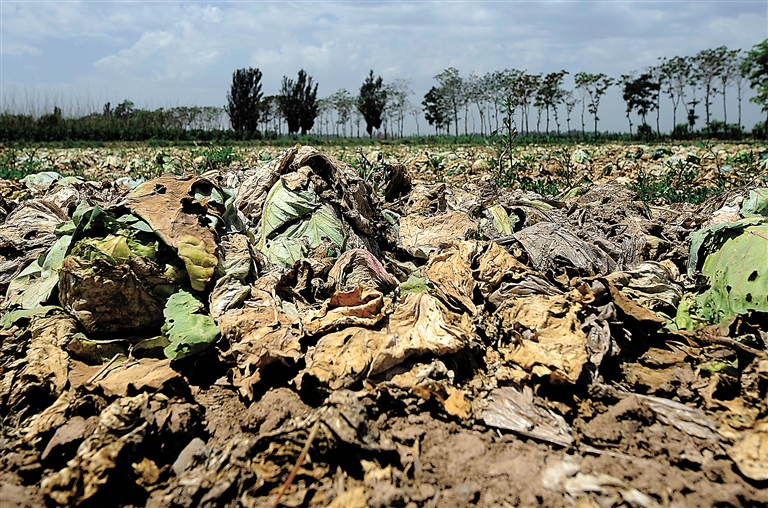 7月2日,在宁夏贺兰县常信乡四十里店村,一些莲花菜在地里腐烂。 近日,宁夏贺兰县常信乡四十里店村种植的1000多亩蔬菜出现滞销情况,部分莲花菜直接在田里腐烂或被倾倒在沟渠中,大批萝卜、茄子等蔬菜遭遇销售难,收购价与去年同期相比下降近5成。 今年贺兰县常信乡四十里店村村民大都选择莲花菜作为头茬蔬菜种植,集中上市后,因产量过大,主要供应的银川市场出现供过于求,导致积压滞销。新华社记者 李然 摄