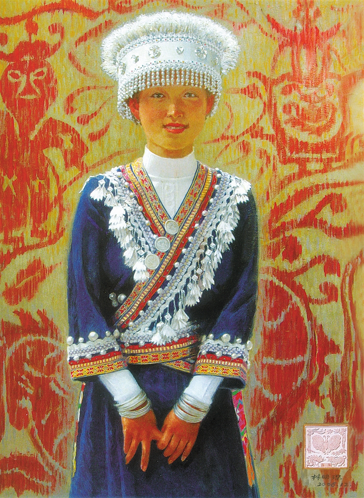 “一组画”是林明琛正在进行的一项艺术创作工程,目前已接近尾声。这组画的创作起源于2001年,当时刚刚退休的林明琛经过深思熟虑,决定以全国56个民族的年轻女性为对象,创作56幅大小一样的人物画,他给这组组画命名为《中华民族·丽人行》。这组画大胆采用浓墨重彩的表现形式,色彩鲜艳纯粹,给人强烈的视觉冲击。这样的创作形式和内容,在国内尚属第一例。