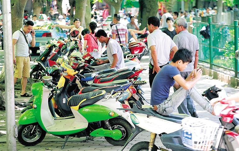 记者在东湖路看到,人行道上呈一字型排满了二手电动车,其中十之八九都是超标车,初步统计有上百辆之多。不少市民正在路边与车商砍价,现场颇为壮观。