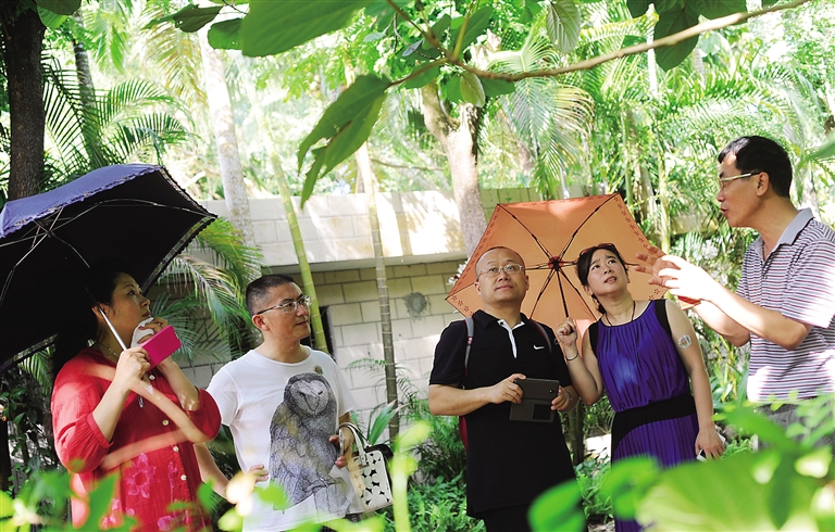 7月7日,来自贵州的游客石先生等人饶有兴趣地参观了海南岛上的“绿色明珠”——兴隆热带植物园,神奇植物令他们叹为观止。该植物园创建于1957年,荟萃了1200多种热带珍稀植物,是我国最早建立的热带植物园。本报记者 苏建强 摄