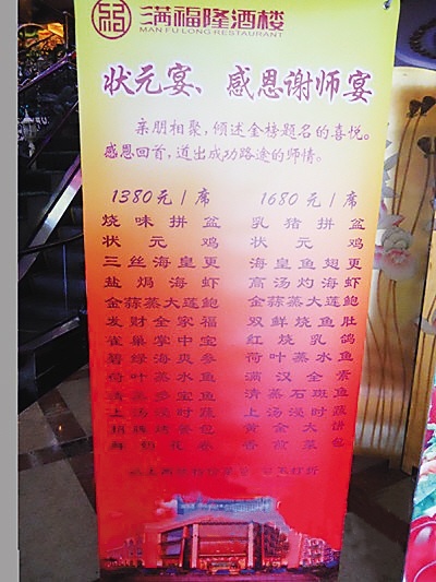 调查中发现,去年以来受大环境的影响,除婚礼和会议订单之外,中高端酒楼的“大单”一直在下滑,于是,面对其实已经降温的谢师宴市场,一些酒店实属“无奈”之下为了促销和提高营业额还是推出了谢师宴促销。
