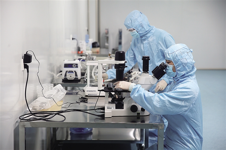 7月7日,在中科院遗传与发育生物学研究所,科研人员在生物材料制备间工作。 中科院遗传发育所戴建武研究团队首次创新性建立了胶原生物材料的生长因子缓释方法,并建立规模化制备平台,制备了多种具有胶原结合能力的生长因子骨修复材料。其中,用于骨缺损填充的生物骨有望明年投入生产。 生长因子是一类具有调节细胞生长、分化等特性的细胞因子,通常与支架材料结合形成智能生物材料,通过生长因子的缓释促进损伤修复。