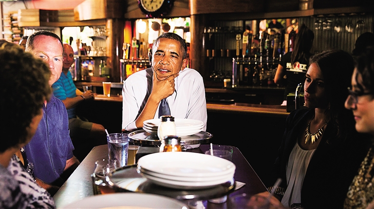 7月8日,美国总统奥巴马(中)在丹佛市短暂停留期间与给他写信的民众见面并共进晚餐。 新华社/路透