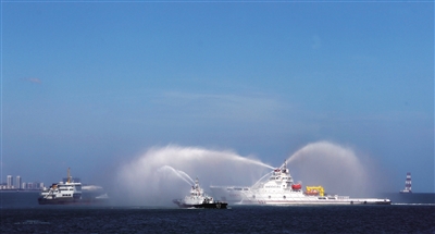 演习场景设置为在海口港附近海域某处,一艘空载客滚船“安通”轮与另一艘装载客滚船“强荣”轮发生碰撞。海口海上搜救分中心接到报警后,立即启动《海口市海上搜救应急预案》一级响应,紧急组织、协调各方力量展开救助。演习历时约为50分钟,共包含五个演练科目:“船舶逃生”、“直升机搜寻救助”、“船舶搜寻救助”、“消防灭火”(见上图,本报记者苏晓杰摄)、“防控清污”。