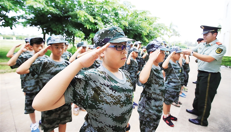 7月6日,在海南消防培训基地,参加暑期夏令营的孩子在消防官兵的示范下学习敬礼。随着暑期的到来,许多家长选择把孩子送到军营中体验生活,在当“兵”的过程中,孩子们拓展了能力,磨炼了意志,得到了一次难得的锻炼机会。 本报记者 张茂 摄