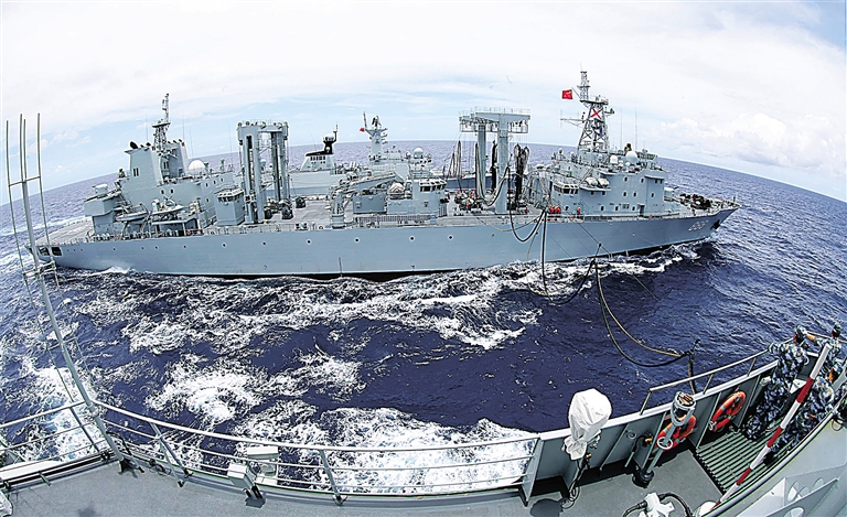 7月12日,综合补给舰千岛湖舰(中)左右舷同时为海口舰(前)、岳阳舰(后)进行液货补给。 当地时间12日,参加“环太平洋-2014”演习海上演习阶段的中国海军舰艇编队所在175.1特混大队,先后进行了警戒幕队形航行、营救落水人员、小艇突击、海上补给、简单机动和航渡6个课目的演练。 新华社发