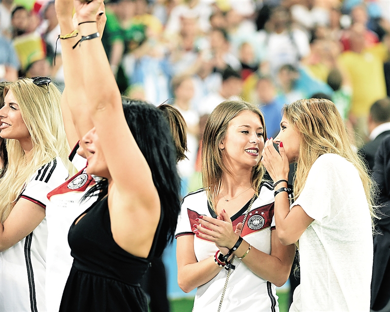 北京时间7月4日,德国队以1:0战胜阿根廷队,获得世界杯冠军。图为德国队球员的夫人和女朋友组成的“太太团”庆祝夺冠。 新华社发