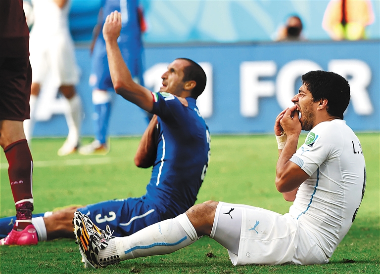 世界杯小组赛与意大利的生死战,乌拉圭前锋苏亚雷斯在一次对抗中狠狠咬了对方后卫基耶利尼,上演了其个人在足球生涯的咬人“帽子戏法”。