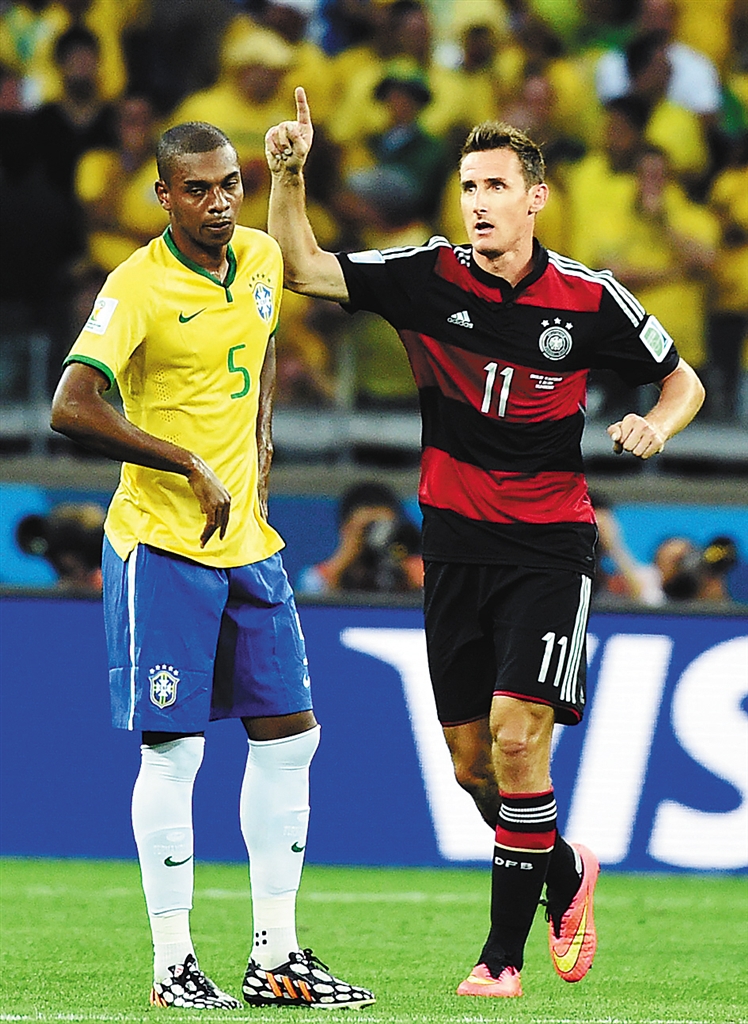 半决赛对阵德国,东道主采用冒险的“搏杀”方式,试图先发制人,打对手一个措手不及。然而,在巴西大举压进的同时,后防完全向实力强大的德国开放,“惨案”因此酿成。这起“惨案”的原因源于四分之一决赛,东道主虽然淘汰了哥伦比亚,但损失了超级球星内马尔以及后防中坚席尔瓦两员大将。