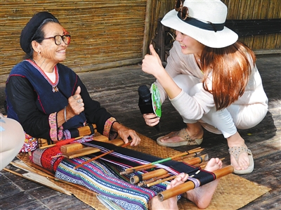 图为主持人向黎族阿婆了解黎族织锦、文身文化。
