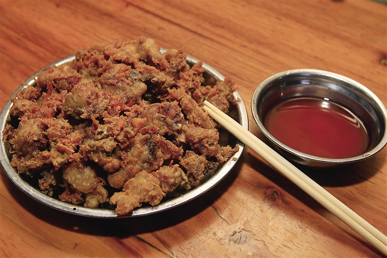 不到6点,渔村炸鸡店的桌子就已经被占满,客人们一人倒上一小碗店家自酿的食醋,焦急等待着店老板把腌制了一天的鸡块放入油锅,在油锅“嗞嗞”的翻滚中,鸡块由肉色变成金黄,老板把鸡块捞出、分盘,再送到每张桌上。