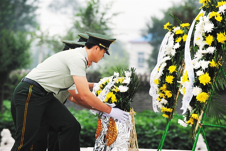 停靠在铁码头、悬挂满旗的某水警区任丘艇和伊川艇,同时拉响汽笛120秒。官兵们脱帽肃立,垂首默哀。随后,8名礼仪兵向“海魂”雕塑台敬献花篮。
