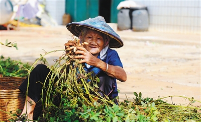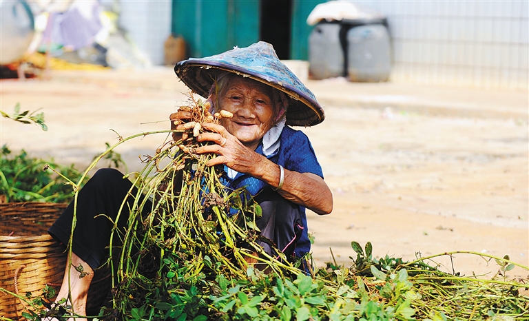 7月24日,海口市秀英区东山镇,85岁的老阿婆陈丽花坐在村口剥着从水中抢收回来的花生。 本报记者 苏建强 通讯员 陈创淼 摄