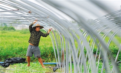 7月25日,定安县龙州洋常年蔬菜生产基地内的农民正在加紧抢修台风刮倒的瓜菜大棚。 本报记者 苏建强 摄