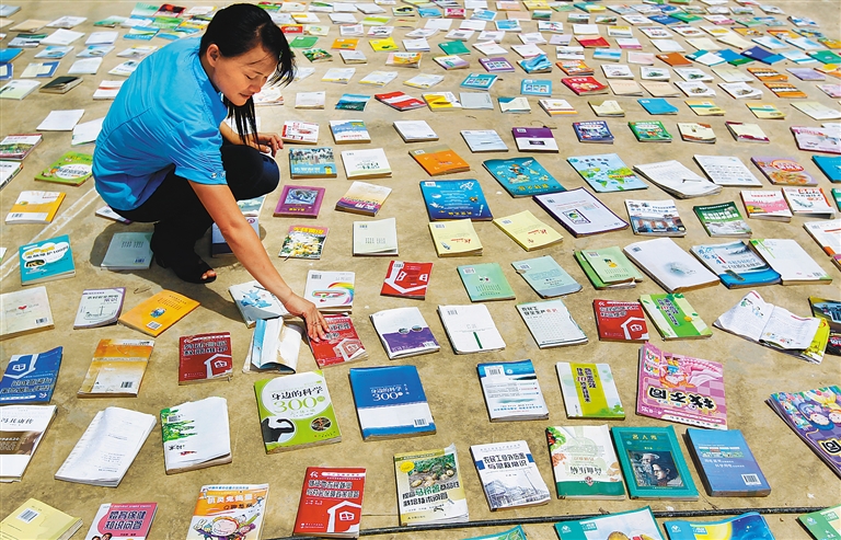 7月24日,一名管理员正在昌江石碌镇水头村篮球场上翻晒被洪灾浸泡过的图书。据介绍,村里农民图书室的近万册农业、农机及自然科学等图书被洪水浸泡。本报记者 苏晓杰 特约记者 黄玉宁 摄