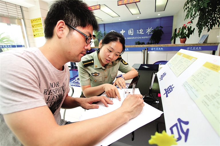 7月25日,江苏如皋边检站业务科实习学员黄迪(右)向办证人员介绍常用证件办理流程。 7月25日从公安部获悉,公安部于近期集中推出提高户口办理时效、推行网上预约办理出入境证件、实行机动车省内跨地市检验等16项便民利民措施,为广大群众提供更多更好服务。新华社发