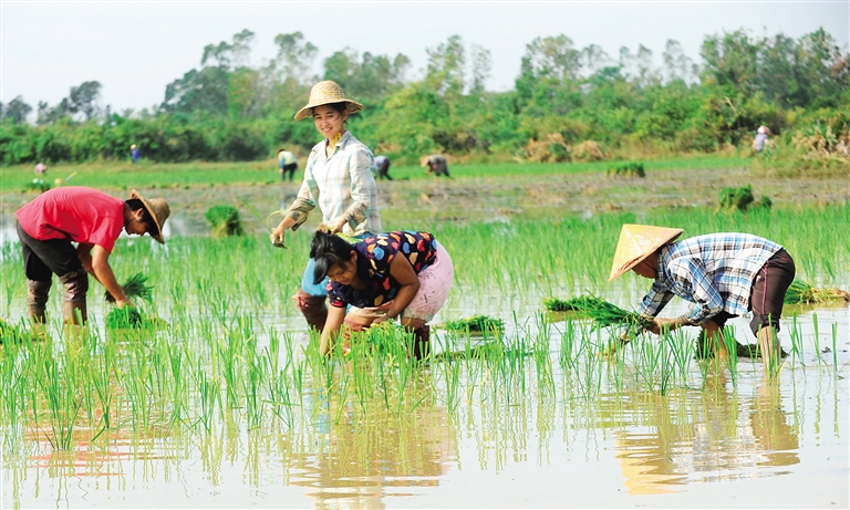 7月24日,海口市秀英区东山镇东星村的水稻田,台风“威马逊”带来的积水尚未退尽,全村群众积极抢种晚稻,加快恢复生产。