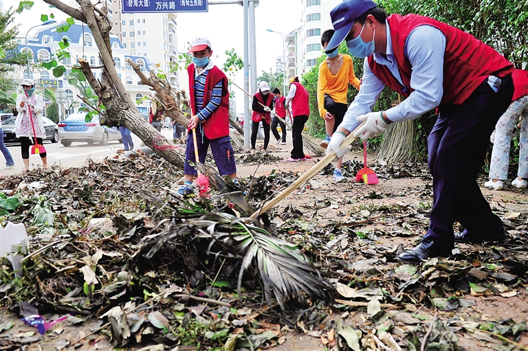 7月26日上午,几位市民志愿者在海口海甸岛万兴路清理路边残枝败叶。当日海口市文明办组织志愿者走上街头,清理小街小巷堆积的垃圾。