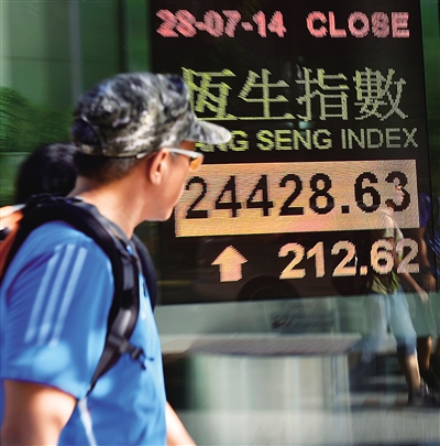 7月28日,行人从香港湾仔一家银行的恒生指数电子显示屏前走过。 当日,港股高开后震荡上行,收市报24428.63点,升212.62点,全日总成交额854.6亿港元。 新华社记者 何靖嘉 摄