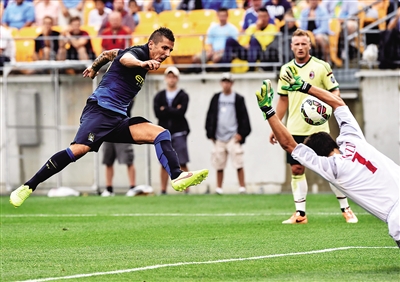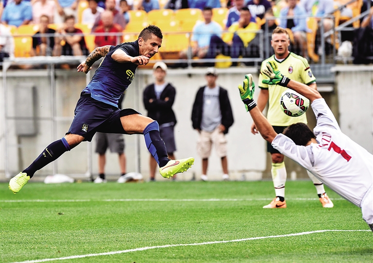 北京时间7月28日凌晨,在美国匹兹堡进行的国际冠军杯B组赛事中,曼城队5:1大胜AC米兰队。曼城队约维蒂奇2射1传,纳瓦斯1球1助攻,克伊希纳乔连续2场破门,辛克莱尔也攻入1球。AC米兰场上队长蒙塔里扳回一分。图为图为曼城队球员约维蒂奇(左)在比赛中射门得分。
