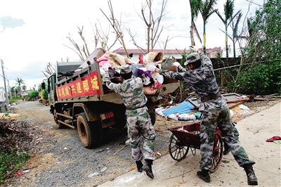 7月28日上午,海口市三江农场梅坡村,海南省军区某部的官兵为村民清理垃圾。本报记者 陈元才 摄