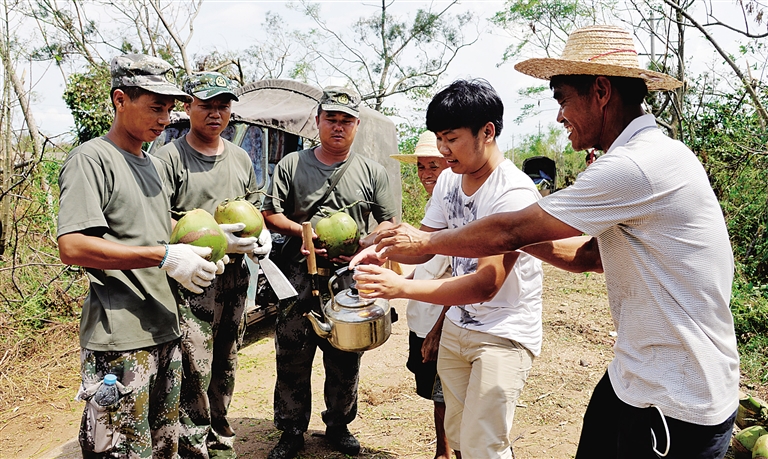 7月25日,海南省军区某预备役官兵在海口灵山镇道楠村清理线路时,当地群众自发给官兵送水送椰子慰问。本报记者 张茂 通讯员 郑晓富 摄