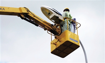 7月28日,三亚市路灯管理所的技术工人在海口市滨海西路抢修路灯。截至记者发稿,海口城区98%条线已经亮灯。