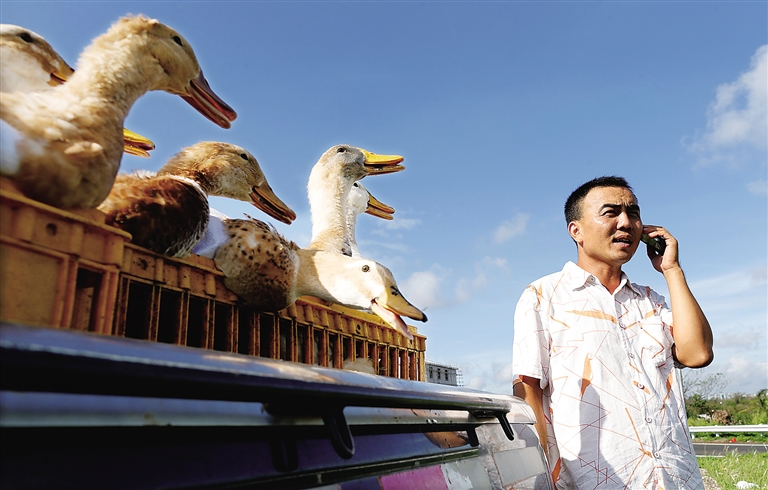 7月28日,在海文高速三江路口,海口市演丰镇长宁头村咸水鸭养殖户黄昌福在跟客户联系送货事宜。