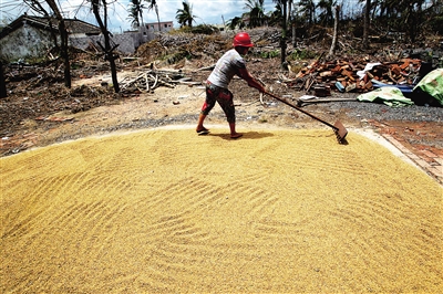 台风过后村民积极开展生产自救。7月28日,海口市三江农场梅坡村,一位村民在晾晒谷子。本报记者 陈元才 摄