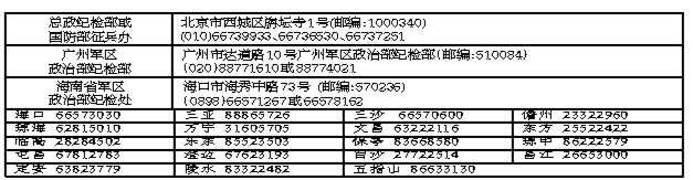 为加强社会和群众监督,确保廉洁征兵工作落到实处。海南省征兵办向社会公开各级廉洁征兵举报电话和信箱,欢迎社会各界对征兵工作进行监督,如有发现违纪违法行为,请及时拨打以下举报电话,有效期为2014年8月1日至9月30日。同时也可以通过信件向各级征兵办公室纪检组进行举报。