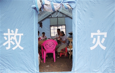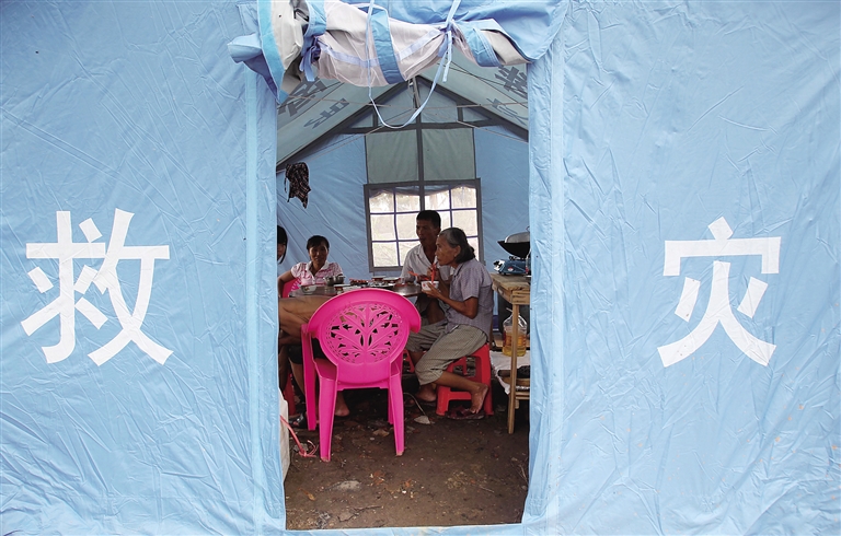 海口市三江农场梅坡村,救灾帐篷成了受灾村民们临时的家,在浓浓的爱心中,简陋的家充满温情。图为7月28日,村民们在帐篷里用午餐。本报记者 陈元才 摄