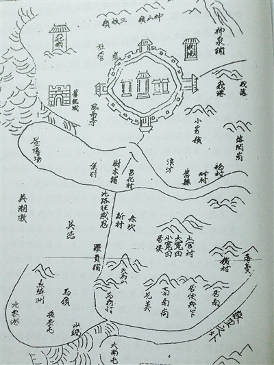 《昌江县志》上的一幅古图,吸引了记者的目光,图中一座古村,与周边村落对比强烈,只有它被带“垛”的城墙紧紧包围,任凭岁月涤洗。