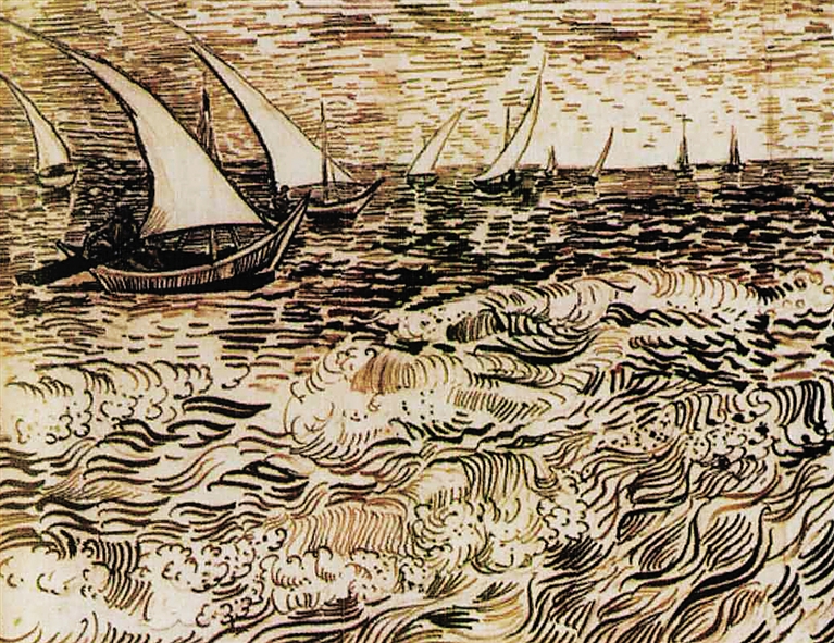 梵高的每幅油画都留有素描底稿,通过两者的对比,我们可以看出,在油画创作之前,梵高就已确定了采用何种笔触来进行形的塑造。他的用笔方圆并用、笔随形转。如在《海上帆船》一画中,近处的波浪用的是翻滚卷动的曲线,突出其腾转飞扬的气势;远处的海面则用短促的线条细细铺排,展示其悠阔旷远的境界,并鲜明地衬托出帆船的轮廓线;天空则用轻细的线条横向平行布列,水天相接之处用留白表现光感。油画的用笔与素描完全一致,画面上舞动着形态各异、激情饱满的线条笔触,同时在整体上又完全具备体量、空间、光线等西画固有的感知要素。