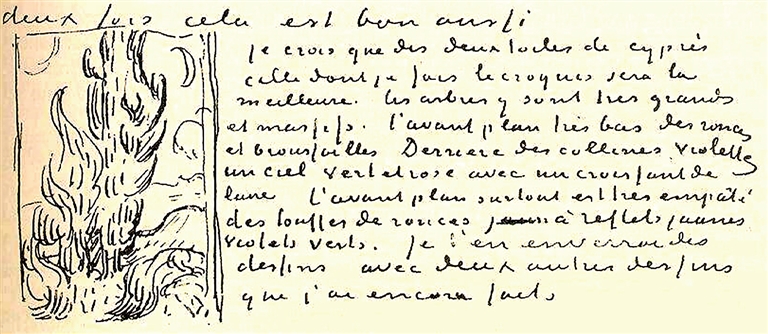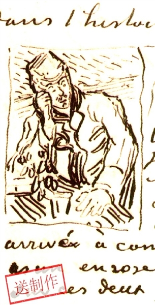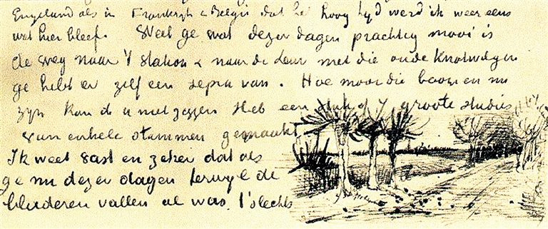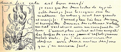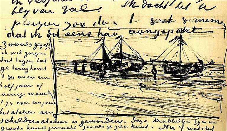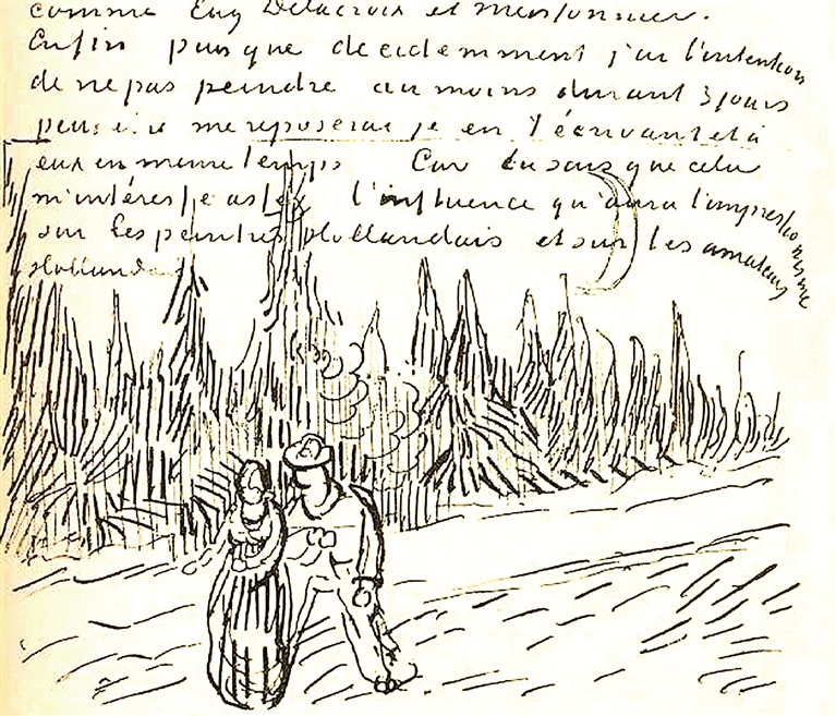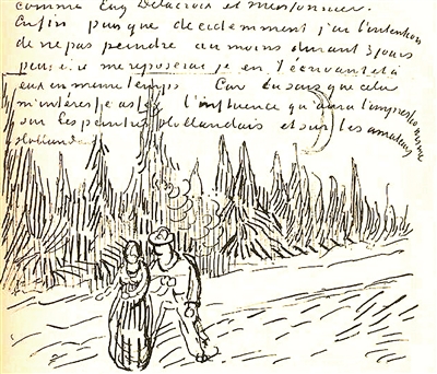 举例来说,梵高(1853—1890)是中国人非常熟悉的画家,他生于荷兰,早年作过职员和商行经纪人,还当过矿区的传教士,其生命的最后五年在法国度过,并完全投身于绘画艺术。在梵高短暂的一生中,他与弟弟提奥始终保持着密切联系,两人之间的来往信件达千封之多。在写给弟弟的信里,梵高谈生活、谈艺术、谈哲学,兴之所至,常常随手在信纸上涂抹出他正在进行创作的油画草图,或者是当时当地所见的风景人物。因是在书写之中绘就,这些涂鸦之作率性自然、简洁明快,与梵高灵动优美的字体相辉映,使我们得以一窥大师运笔挥洒的精妙细节以及“画法”与“笔法”之间的微妙关联。