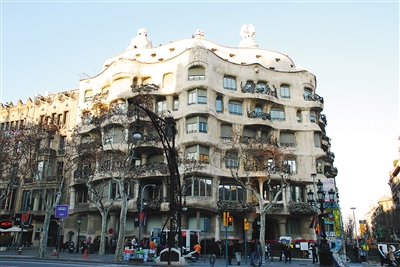 第二站是离圣家堂不远的米拉公寓,走了约四个街口,大概两站地铁路程。如果不是慕名而至,在这熙熙攘攘的格拉西亚奢侈品大街,我差点就错过了。米拉公寓没有色彩斑斓的外观,采用白色的外墙和铁条铁板构成的阳台栏杆,但那无一处是直角的波浪外观,又给予人们无限的想象空间。有人觉得像是熔岩构成的波浪,但我觉得,这更像是漂浮在空中的一大片云朵,柔和、唯美而富有流动感。顺着格拉西亚大街一路往前,突然被一栋五彩斑斓的小楼深深吸引住了。翻看手中的明信片才知道,原来这是巴特略之家。据说在高迪改造前是一幢平淡无奇的小楼,而如今却是充满童话色彩的宫殿,马赛克陶瓷的砖片装饰出的外墙,渐变出绿色、蓝色、金色和橙色,如梦如幻……无论是米拉公寓还是巴特略之家,尽显着高迪“自然界的一切都是曲线”的理念,房子不再是冷冰冰硬邦邦的钢筋水泥,而是离我们很近很近的心灵之屋……我想住在这些房子里的人是幸福的,而曾经来过这些房子的人也同样是幸福的。