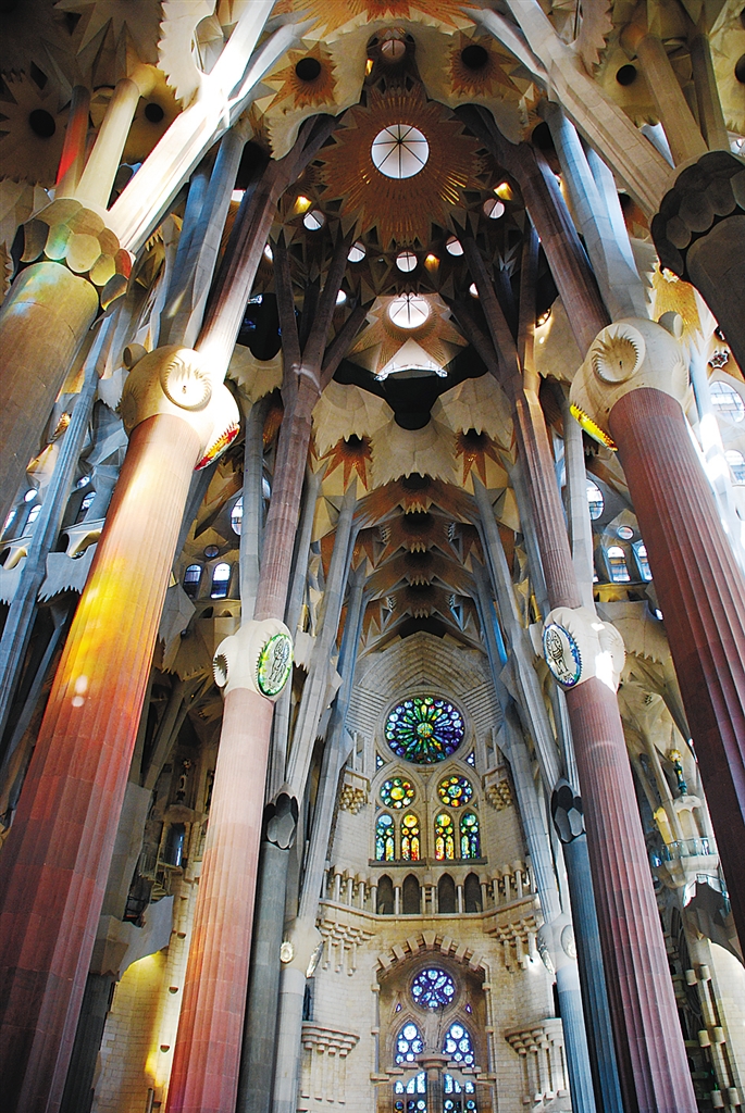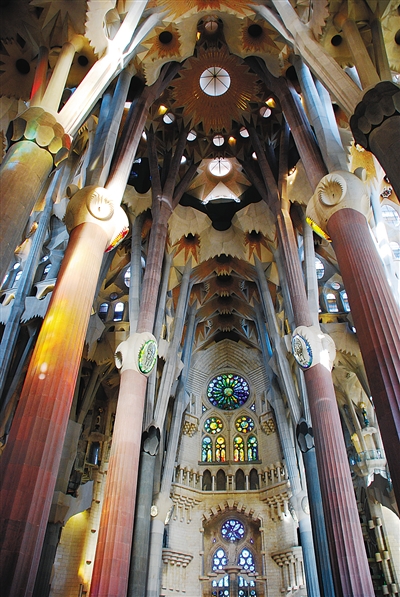 型,又让我眼花缭乱。当走进教堂,棕榈树造型的高大石柱拔地而起,富丽堂皇的五彩玻璃窗,像是步入了一座“森林”,感受着阳光透过彩色玻璃照射在身上的温暖与奇妙。世界上教堂无数,然而每个教堂给人的感觉也截然不同。见过罗马圆拱顶的极具宗教色彩的圣彼得大教堂,见过哥特式尖塔的富有文学剧情的巴黎圣母院,真的无法简单地将圣家堂归结到哪类。因为它将宗教、艺术与自然三者做到了完美的结合。