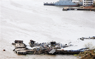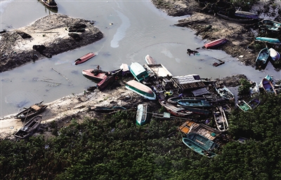 “威马逊”过后第四天,低洼处仍需蹚水。环岛沿岸的海水里漂着枯黄的水浮莲、死去后肚皮圆鼓鼓的家禽、一两尺长的死鱼。由于潮水位高过避风港,141条渔船绝大部分损毁。