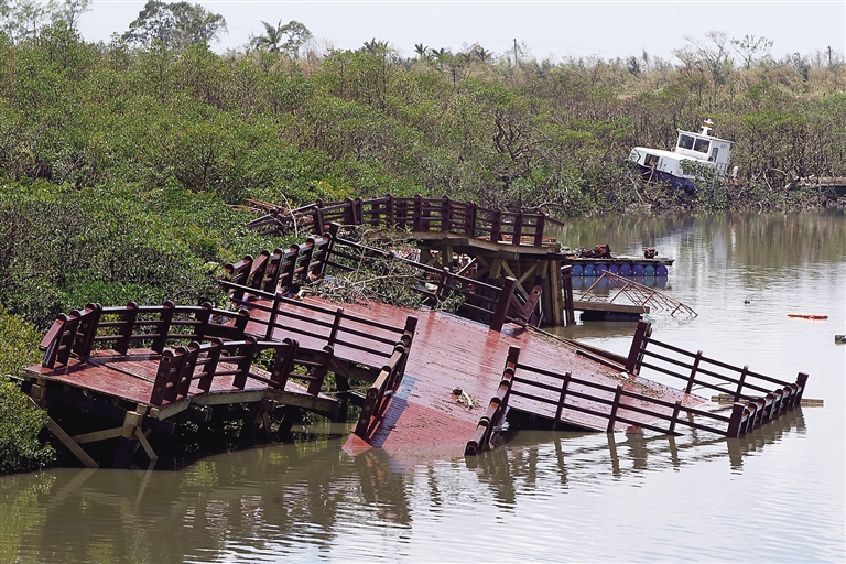 除去大坝决堤海水倒灌因素,躲在红树林后面的村庄和建筑,大部分受灾不太严重。“威马逊”过后,海南东寨港红树林国家级自然保护区管理局副局长陈松发现:“红树林潮间带较厚的地方,受灾的影响要小得多。”