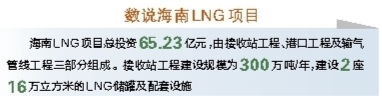 海南LNG项目接收站站址位于洋浦经济开发区神尖角海岸段。项目占地57.2公顷,工程总投资65.23亿元,由接收站工程、港口工程及输气管线工程三部分组成。接收站工程建设规模为300万吨/年,建设2座16万立方米的LNG储罐及其配套的卸料、储存、转运、气化、天然气外输等设施。港口工程建设1座可停靠26.7万立方米LNG船舶的接卸码头以及1座3000吨级工作船码头。输气管线工程新建输气管线114公里,设计输气能力138亿立方米/年,新建输气管线将与海南省环岛天然气管网相连接,形成全省“一张网”,使清洁能源通往千家万户。(相关报道见A03版)