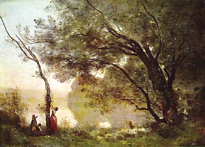 在《蒙特枫丹的回忆》里,我读懂了画家内心的忧伤和淡淡的哀愁。两棵树,只有两棵。一棵巨大,几乎占据了整个画面,在它浓郁而蓬勃的绿影里,我看到了深邃的意境。另一棵则与之遥相呼应,形成绝然相反的对比——在大树面前,它是那么渺小而无助,树枝已然枯萎,只留下孱弱的枝条,而旁边已经生出许多蘑菇。农妇和她的孩子们,没有意识到枯树的悲剧,却闻到了蘑菇的香气。这就是生活,虽然贫苦,却执着地挚爱。最令人感动的是那波光云影尽收其中的湖面,它静静地接纳自然界中的一切,自己也成为自然的组成部分。这幅情景交融的画作,其实是画家内心世界的一次无比震撼的抒情。它之所以成为柯罗的代表作,是因为它几乎襄括了画家所有风景画的艺术追求。