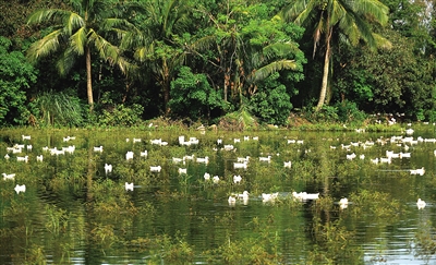 ⬆ 8月6日,海口市秀英区东山镇东星村村边塘下又现生机勃勃鸭满塘的美丽乡村景象。“威马逊”过后,该村村民积极恢复生产,并重购大批鸭苗投放。