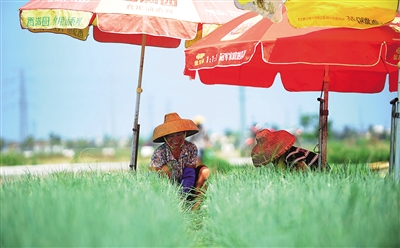 ⬅ 8月6日,海口市秀英区西秀镇龙头村,妇女正在菜田里收割香葱。此处田洋面积达900多亩,在台风灾害中全部泡水。村民第一时间抢救,恢复了其中400亩的叶菜生产。
