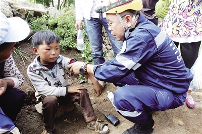 8月6日,三亚市红十字灾害救援队突进重灾区,途遇受伤儿童鲍向松,救援队队长陈锐为他查看伤势。