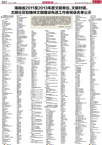 海南省2011至2013年度文明单位、文明村镇、 文明社区和精神文明建设先进工作者候选名单公示