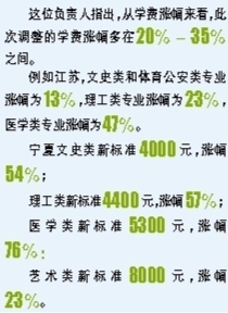 “根据目前比较通行的用收费与家庭户均收入比来判断居民家庭分担高等教育费用实际承受能力的方法,9个省份调整后的学费标准一般专业在4000-6000元之间,艺术类专业在7000-12000元之间,基本在城乡居民可承受范围之内。”这位负责人说。