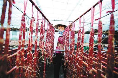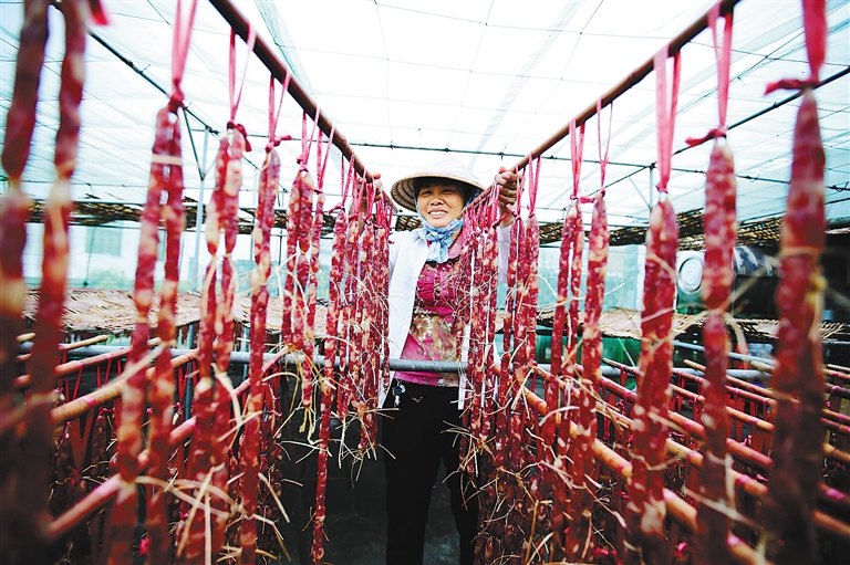 8月20日,商户在澄迈瑞溪镇晒制新鲜腊肠,准备销往省内外。据了解,该商户每天制作出产腊肠约150斤,一年产量5.5万斤,年收入在30万元左右。目前,瑞溪镇传统手工制作的牛肉干、腊肠等加工产业已初具规模。与此同时,越来越多的商户开始将这些土特产在网上“摆摊”,让澄迈土特产走向省外。 本报记者 张茂 通讯员 王家专 摄