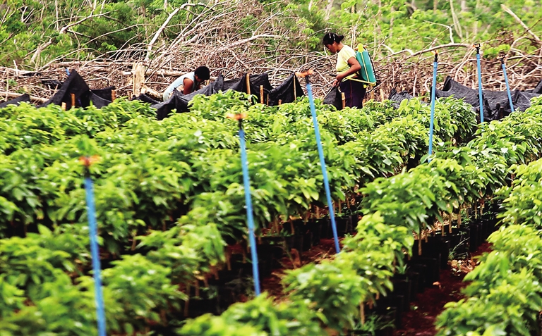 8月19日,在海口市三江农场的一个花圃里,花农正在除草杀虫。目前,该地区很多因灾被毁的花圃已经恢复正常生产。本报记者 陈元才 摄