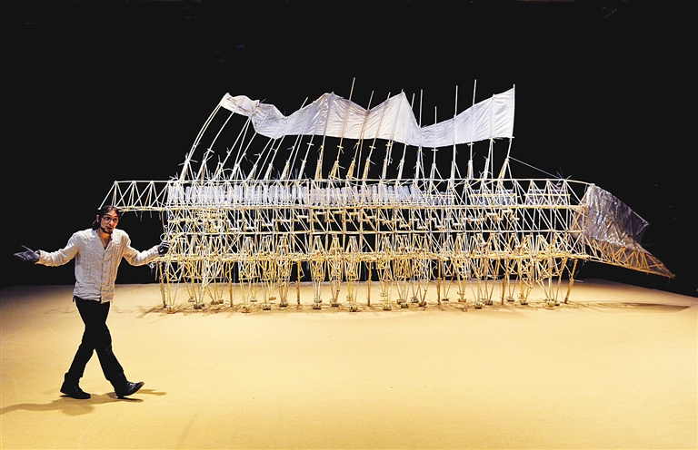 近日,一名设计师在巴黎科学与工业城介绍多腿风力机器人。 启动于1986年的巴黎科学与工业城并不是一座传统意义上的博物馆,而是一处运用游戏方式来介绍现代科学与技术的实验工场。它涵盖了宇宙、生命、物质和通讯交通四大部分,并设有图书馆和多媒体馆等设施,深受广大游客的喜爱。