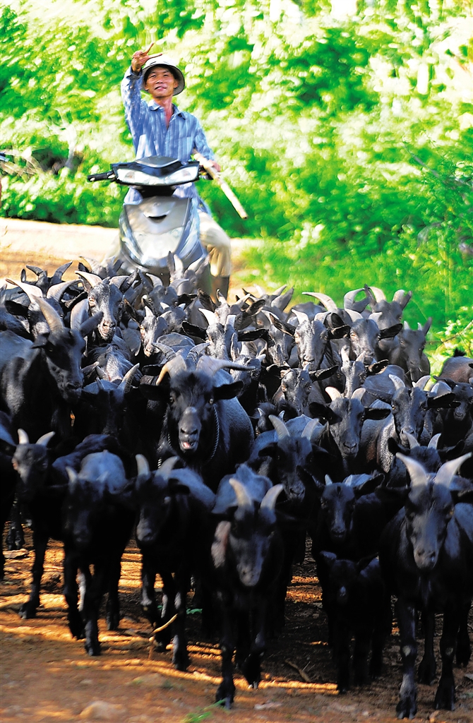 ⬅ 8月25日,海口市府城镇那央村村民小周正在牧羊。超强台风“威马逊”来临时,他家位于荷塘边的羊圈倒塌,砸死了很多羊,损失巨大。但是小周没有气馁,重新购买羊羔,修缮房屋,准备在荷塘边开辟一家以赏荷花、吃羊肉为主题的农家乐。本报记者 苏建强 摄