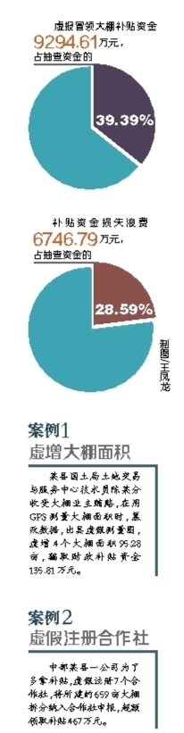 但审计也发现了不少违法违规问题。其中:虚报冒领大棚补贴资金9294.61万元,占抽查资金的39.39%;121个计5180.15亩大棚损毁或闲置,补贴资金损失浪费6746.79万元,占抽查资金的28.59%。